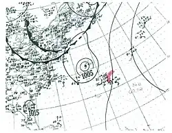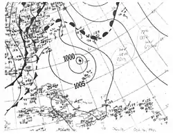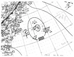 A tropical wave ascended to tropical storm status by 06:00 UTC on September 28 while located about 230 mi (370 km) south of Bermuda.[7] It moved northwest and then west-northwest, steadily organizing to attain peak winds of 65 mph (100 km/h) early on September 30. The storm then moved ashore the central coast of Maryland and was last distinguishable near Williamsport, Pennsylvania, around 00:00 UTC on October 2.[8] Considerable damage to crops, and lesser damage to structures, was inflicted throughout the Norfolk and Cape Charles, Virginia, areas, with damage estimated at $20,000.[10] Rainfall was generally light, peaking at 4.6 in (117 mm) in Diamond Springs,[9] but did result in some street flooding. A small ship and several small boats were sunk. Atlantic City, New Jersey, reported a maximum gust of 70 mph (113 km/h), and only slightly weaker gusts were recorded throughout Virginia. One death was reported.[10]