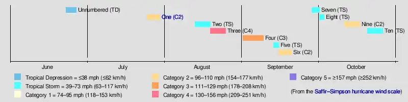 One July 25 – 30 Category 2 hurricane 105 (165) 967 Texas, Louisiana $17 million 19 [6]