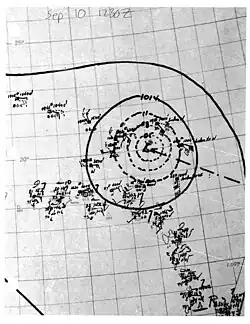 Another short-lived tropical storm was first identified about 195 mi (314 km) east of Guadeloupe by 12:00 UTC on September 9. Data from a reconnaissance aircraft indicated the storm intensified slightly to attain winds of 60 mph (97 km/h) by early the next day,[2] in spite of a poorly defined circulation center.[3] It tracked northwest and then north, passing within 130 mi (210 km) of Bermuda before dissipating around 18:00 UTC on September 12.[2]