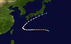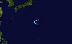 Pearl originated from a tropical depression located south of the Northern Mariana Islands on July 1. Developing into a tropical storm several hours later, further development occurred as Pearl tracked northwards, with it becoming a typhoon the next day. As a result, on July 4, Pearl peaked as a modern-day very strong typhoon with sustained winds of 90 knots (105 mph) Several days later, on July 6, Pearl made landfall 40 miles east of Shanghai, veering to the northwest. Weakening occurred after this landfall, and by the time Pearl struck what is now South Korea, it was a minimal tropical storm. A weakening Pearl tracked northwards before dissipating in Manchuria on July 8.[6]