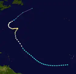 On September 8, Tropical Storm Fox was present in the open Atlantic Ocean between the Lesser Antilles and Cape Verde, likely originating from a tropical wave. Hurricane Fox was first discovered by Hurricane Hunters on September 10, when it was located about 1,000 mi (1,600 km) east of Puerto Rico. A small system, the hurricane moved generally northwestward and gradually intensified. After turning toward the north, Fox reached its peak intensity with maximum sustained winds of 140 mph (230 km/h) on September 14, as it passed about 300 mi (480 km) east of Bermuda. Following its peak intensity, the hurricane accelerated to the north and northeast. By September 17, Fox had lost all tropical characteristics, and later that day the circulation dissipated about halfway between the Azores and Newfoundland. Fox never affected land along its path. When Fox dissipated, it was the first time in 36 days without an active tropical cyclone in the Atlantic Ocean.[6][9]