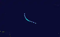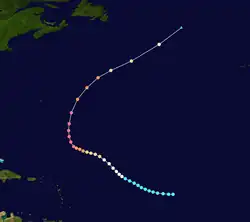 Hurricane Charlie developed on August 21 to the southwest of the Cape Verde islands.[9] At the time, the Weather Bureau did not consider Charlie to be a tropical cyclone until almost a week later. For four days, the storm tracked generally to the west as a weak tropical storm. On August 25, it turned to the northwest and intensified, becoming a hurricane on August 28. On August 30, Charlie attained peak winds of 110 mph (180 km/h), although the Hurricane Hunters estimated higher winds. At the time, the hurricane was stalled to the east-southeast of Bermuda, and subsequently turned to a westward drift.[6] On September 2, Charlie turned to the north and northeast. At the time, it co-existed with two other hurricanes, Dog and Easy; it is a rare occurrence for three hurricanes to exist simultaneously in the Atlantic. Charlie slowly weakened and lost tropical characteristics, and by September 5 Charlie had transitioned into an extratropical cyclone about 480 mi (770 km) southeast of Halifax, Nova Scotia. It dissipated later on September 5 without having affected land.[6][9]