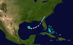 Hurricane Easy developed on September 1 from a trough in the western Caribbean, which persisted after Hurricane Baker moved through the region in late August. Moving northeastward, the hurricane crossed Cuba on September 3 and entered the Gulf of Mexico. Easy turned to the northwest and strengthened to its peak intensity as a Category 3 hurricane. At the time, Easy was located just off the west coast of Florida; however, a ridge to its north caused the hurricane to stall, execute a small loop, and make landfall near Cedar Key. Following the landfall, Easy moved offshore, turned to the southeast, and made a second landfall near Hernando Beach on September 6. The hurricane turned northwestward over the Florida Peninsula, and gradually weakened as it moved into Georgia and the southeastern United States. On September 9, Easy dissipated over northeastern Arkansas.[6][9]