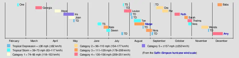 The season began with the formation of a short-lived unnamed tropical storm on February 19, well east of the Philippines; Typhoon Georgia became the season's first named storm and typhoon after first developing in the open Pacific on March 20. In April, Typhoon Iris developed before intensifying into a super typhoon the following month; Iris was the first recorded instance of a Category 5-equivalent typhoon in the western Pacific. The final typhoon and storm of the year was Typhoon Babs, which remained at sea before dissipating on December 17.