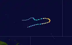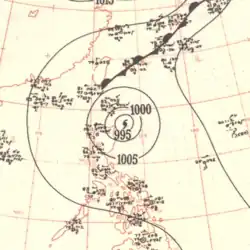 A disturbance was first noted in the vicinity of Micronesia on June 17 approximately 400 km (250 mi) south of Guam. Aircraft traversing between Guam and the Philippines eventually confirmed the presence of a developing tropical depression by June 25, tracking towards the west.[7] By the following day, the system had strengthened into a tropical storm. The system curved towards the north by June 28 and had begun to trend towards the northeast thereafter, gradually strengthening to a typhoon by 18:00 UTC that day. The storm continued to accelerate towards the northeast, passing just east of the Ryukyu Islands on June 30 before reaching peak intensity offshore Kyushu with maximum sustained winds of 185 km/h (115 mph) and a central pressure estimated at 975 mbar (975 hPa; 28.8 inHg). Kate weakened slightly before making landfall the following day on Shikoku with winds of 170 km/h (110 mph).[16] The typhoon curved eastward and continued to weaken, tracking through Sagami Bay and emerging over the Pacific Ocean on July 2 as a tropical storm.[7][16] Kate transitioned into an extratropical cyclone and would later dissipate the following day.[17]