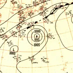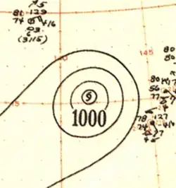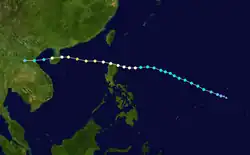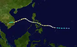In late April, a well-developed tropical wave began developing east of Chuuk Lagoon.[9] Tracking westward, the easterly wave was analyzed to have organized into a tropical depression by 0000 UTC on April 29.[10] Twelve hours later, Iris was estimated to have strengthened into a tropical storm.[11] At roughly the same time, a vessel in the vicinity of the storm reported winds in excess of 65 km/h (40 mph), prompting the Guam Fleet Weather Center to initiate reconnaissance flights into the cyclone.[7] Midday on April 30, Iris intensified into the equivalent of a modern-day typhoon as it moved in a slightly oscillatory path towards the Philippines.[7][11] After a slight fluctuation in intensity during the overnight hours of May 1, Iris rapidly intensified to reach its peak intensity with a minimum pressure of 909 mbar (909 hPa; 26.8 inHg) and maximum sustained winds of 280 km/h (170 mph) early on May 4,[11] making it the equivalent of a Category 5 super typhoon;[10] at the time this was the first confirmed instance of a typhoon reaching such intensities.[2] Afterwards, Iris weakened slightly before making landfall on South Luzon around 1800 UTC the following day.[11]