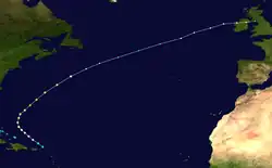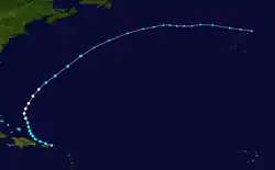 Shortly behind Dolly, another tropical wave spawned a tropical depression over the Lesser Antilles on September 15.[3] As it moved through the region, it produced unsettled conditions across the northeast Caribbean.[24] Edna quickly intensified as it tracked northwestward, attaining hurricane status on September 15 and peak winds of 115 mph (185 km/h) the next day. After peaking, the hurricane turned to the northeast and maintained most of its intensity for a few days.[3] It passed just north of Bermuda early on September 18 with winds of 115 mph (185 km/h), before beginning a steady weakening trend as it accelerated. By September 19, Edna completed the transition into an extratropical cyclone, lasting another day before dissipating west of Ireland.[8]
