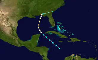 A tropical depression formed in the central Gulf of Mexico on September 15 and moved northeastward.[8] The storm produced heavy seas across the region, which damaged two small boats.[27] The storm reached peak winds of 50 mph (75 km/h) while moving in a small clockwise loop southeast of Louisiana. The storm weakened into a tropical depression on September 17, but re-intensified to a tropical storm three days later. On September 20, the storm moved ashore in Taylor County, Florida and dissipated the next day over the state, bringing 2 to 5 in (51 to 127 mm) of rainfall to coastal areas.[8][9]