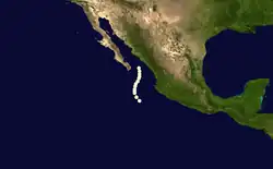 A tropical cyclone first formed on September 13 near Western Mexico (in the extreme southern Gulf of California) while generating winds of 30–40 mph (50–65 km/h). It traveled north-northeastward[3] and Three was upgraded into a hurricane on September 14 while reaching its maximum sustained wind speed of 85 mph (135 km/h).[6] After turning east-northeast, Hurricane Three attained its peak pressure of 982 mbar (29.0 inHg).[3] The storm held on to its wind speed, until September 17, when the storm dissipated.[6] The remnants of the storm deluged the Mexican coast with rain, especially in Sinaloa. Winds of 45 mph (70 km/h) were reported in Mazatlan on land; however, no damage was recorded.[3]
