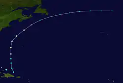 A tropical depression formed in the Central Atlantic on September 25. It drifted east-northeastward, eventually becoming a tropical storm on September 29. The storm curved to the west and west-southwest, becoming a hurricane on October 2. It turned to the northeast on October 3, and reached a peak of 100 mph (160 km/h) winds about halfway between Bermuda and the Azores. By that point it began accelerating, and late on October 6 the hurricane became extratropical over the Northeastern Atlantic. Early the next day it was last observed to the south of Iceland.[4] The hurricane was not named due to its presence in the eastern Atlantic and not being a threat to land.[35]