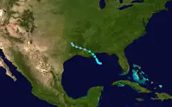 A weak disturbance was first observed near Grand Cayman on August 23.[4] The disturbance moved northeastward into the Gulf of Mexico, where it became a tropical depression late on August 25. Early the next day, the depression intensified into a tropical storm. The tropical storm marginally strengthened further, peaking with maximum sustained winds of 45 mph (72 km/h) by 0000 UTC on August 27. Nearing the Gulf Coast of the United States, the system curved towards the west.[7] The storm maintained its intensity up until landfall in Louisiana near New Orleans about four hours later.[4] Moving inland, it slowly weakened while crossing the Central United States, degenerating to tropical depression strength by August 28 and dissipating over east-central Texas several hours later.[7]