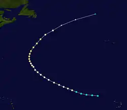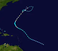 An easterly tropical wave developed into a tropical depression on August 21 in the tropical Atlantic.[4] Moving towards the west-northwest, the disturbance slowly intensified, reaching tropical storm strength at 1200 UTC on August 23 and as such was named Edith by the Weather Bureau.[7][27] Afterwards, Edith began to curve towards the northwest as it gradually intensified, attaining hurricane strength on August 26, but weakened back to a tropical storm early the next day. The storm re-intensified as it northeastward and accelerated, re-attaining hurricane status early on August 29. Edith became a Category 2 hurricane on August 30 and soon peaked with maximum sustained winds of 100 mph (160 km/h) and a minimum pressure of 967 mbar (28.6 inHg).[7] The hurricane began to gradually weaken after it passed east of the island, before becoming extratropical on August 31. The extratropical cyclone would later make a clockwise loop before dissipating completely early on September 5. Although Edith remained at sea,[7] it was suspected that the hurricane may have caused the loss of the pleasure yacht Connemara IV, after it separated from its moorings.[28]
