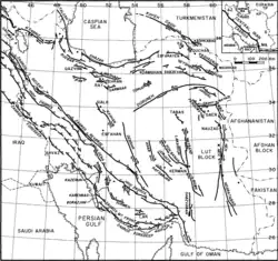 The Iranian plateau is a region of highly deformed crust wedged between the Arabian Plate to the southwest and Eurasian Plate to the northeast. Crustal deformation is dictated by oblique-convergence between the two tectonic plates. Deformation is accommodated by reverse and strike-slip faulting. Off the country's Makran coast, the seafloor undergoes active subduction. In northern and southern Iran, thrusting allows convergence through crustal thickening to take place. Most of the convergence is accommodated along fold and thrust belts of the Zagros, Alborz, Kopet Dag mountains, and in eastern Iran, where seismicity is high. Seismicity in the central plateau is low due to its geology consisting of rigid and aseismic tectonic blocks such as the Central Iran, Lut and Southern Caspian blocks.[4]