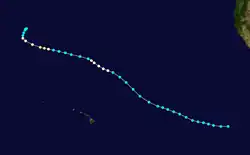 The fifth tropical cyclone to form or enter the central Pacific was first identified on September 25 several hundred miles south of the Hawaiian Islands. Traveling nearly due west, the storm attained an intensity of 50 mph (80 km/h) before weakening. By September 27, the storm weakened to a tropical depression and later dissipated on September 28 over open waters.[2]