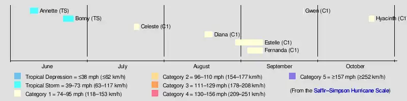 Hurricane Diana formed on August 16[5] And reached hurricane strength on August 17 where it moved northwestward.[2] Diana briefly weakened into a tropical storm on August 18 before reaching hurricane strength again the following day.[6] After brushing southern Baja California Peninsula, Diana entered the Gulf of California where it became extratropical on August 20.[2]