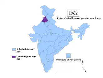The Election Commission of India held indirect third presidential elections of India on 7 May 1962. Dr. Sarvepalli Radhakrishnan with 553,067 votes won the presidency over his rivals Chowdhry Hari Ram who got 6,341 votes and Yamuna Prasad Trisulia who got 3,537 votes.