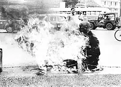 A Vietnamese Mahayana Buddhist monk, Hòa thượng Thích Quảng Đức, burned himself to death at a busy street intersection in Saigon. He was protesting the persecution of Buddhists by Diệm's government. Associated Press (AP) photographer Malcolm Browne took a photograph of the incident which was published on the front page of nearly every newspaper in the world.[20]: 284