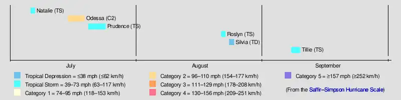 During this season only six tropical storms developed, of which two intensified into hurricanes. Of the two hurricanes, one reached Category 2 intensity of the Saffir-Simpson Hurricane Wind Scale. No storms reached major hurricane status (Category 3 or higher on the hurricane scale), an unusual occurrence. The first tropical cyclone of the season, Tropical Storm Natalie made landfall in Mexico in early to mid-July. About a week later, Hurricane Odessa became the strongest storm of the season in terms of wind speed. Tropical Storm Prudence brought high waves to Southern California, while becoming the strongest storm of the year in terms of barometric pressure. In addition, Tropical Storm Tillie produced severe flooding to much of the Southwestern United States, in particular in Arizona in early to mid-September.