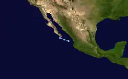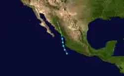 The last tropical cyclone of the season, Tropical Storm Tillie, developed on September 7. At first, the cyclone moved north-northwest;[3] Tillie reached its peak intensity of 60 mph (95 km/h) at that time of its formation approximately 150 mi (240 km) west of Mazatlan.[5] Early on September 8, while located about 100 mi (160 km) southwest of Cabo San Lucas, Tillie began a gradual turn towards the west-northwest. Tropical Storm Tillie dissipated at 0600 UTC on September 9[3] off the coast of California,[9] having only been a tropical cyclone for just over two days.[3]