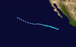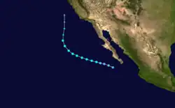 On June 4, a tropical depression formed 585 miles (941 km) southwest of Acapulco, Mexico Early the next day, the depression system intensified into the first tropical storm of the season and was named Victoria. At that time, the storm was at its peak intensity of 50 mph (80 km/h) which it retained while moving the northwest. Early on June 7, the tropical storm weakened into a tropical depression before dissipating six hours later. [1] In all, Tropical Storm Victoria stayed at sea.