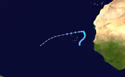 A tropical wave moved off the western coast of Africa on October 2 and spawned an area of disturbed weather that steadily organized as it moved northward between Africa and Cabo Verde. It became a tropical depression at 12:00 UTC on October 3 and maintained that strength for a few days. On October 7, a ship measured 40 mph (64 km/h) winds, the impetus for upgrading the depression to Tropical Storm Kendra. The organized nature of the system on satellite imagery suggested it may have become a tropical storm as early as October 4, but the sparsity of observations precluded an upgrade. The cyclone curved toward the southwest and began to weaken as its convection dissipated. At 00:00 UTC on October 10, it degenerated to a remnant low which dissipated into an open trough over the central Atlantic the next day. Kendra has been the focus of multiple analyses, as it was originally classified as a tropical storm, revoked as a tropical cyclone in post-season review, and finally re-designated as a tropical storm during reanalysis.[12]