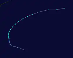 The incipient disturbance that became Super Typhoon Kit was first identified on June 20 near Chuuk State in the Federated States of Micronesia.[14] The JMA designated that system as a tropical depression that day as the system moved steadily westward.[15] The JTWC followed suit with this classification on June 22 following an investigation by reconnaissance. Early the next day, the depression acquired gale-force winds and was dubbed Tropical Storm Kit. Turning to the northwest, Kit developed a 35–55 km (22–34 mi) wide eye and reached typhoon status late on June 23.[14] Rapid intensification ensued late on June 24 into June 25; Kit's central pressure dropped 51 mbar (hPa; 1.5 inHg) in 18 hours from 965 mbar (hPa; 28.50 inHg) to 914 mbar (hPa; 26.99 inHg).[16] During this time, Kit's eye contracted to 13 to 17 km (8.1 to 10.6 mi).[14] At 06:00 UTC on June 26, the JMA estimated Kit's pressure to have abruptly dropped to 880 mbar (hPa; 25.99 inHg),[15] which would rank it among the top ten most intense tropical cyclones on record.[17] Around this time, the JTWC estimated Kit to have attained peak winds of 315 km/h (195 mph);[16][18] however, these winds are likely an overestimate.[1] A later reconnaissance mission on June 26 reported a pressure of 912 mbar (hPa; 26.93 inHg), the lowest observed in relation to the typhoon.[14] Weakening ensued thereafter as the system accelerated to the north-northeast. Retaining typhoon strength, Kit brushed southeastern Honshu, Japan, on June 28, passing roughly 155 km (96 mi) east of Tokyo. The system subsequently weakened to a tropical storm and transitioned into an extratropical cyclone south of Hokkaido on June 29.[16] The National Oceanic and Atmospheric Administration reported the remnants of Kit to have dissipated the following day near northeastern Hokkaido.[19] However, the JMA states that the system turned eastward and accelerated over the north Pacific before losing its identity on July 3 near the International Date Line.[15]