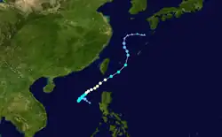 - ^ This system is considered a tropical storm with peak winds of 75 km/h (45 mph) and a minimum pressure of 995 mbar (hPa; 29.38 inHg) by the China Meteorological Agency, Hong Kong Observatory, and Japan Meteorological Agency.[81]