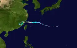A low-pressure system formed in the western Pacific on August 21. Initially drifting west-northwest, the system slowly developed and intensified to tropical storm status by August 28. It was named Betty. Betty reached peak intensity on August 30. Betty then turned northeastward, and made landfall near Yeosu, South Korea, on August 30 as a tropical storm. It later transitioned to an extratropical cyclone on September 1 and dissipated on September 4. No significant damage or casualties were documented, attributed to its moderate strength and landfall in less populated regions.