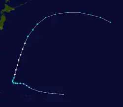Kim formed southeast of Guam on May 28. It intensified into a Category 3 typhoon while curving northeast. Kim slowly weakened as it moved north. The storm dissipated on June 5.