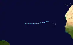 A tropical wave developed into a tropical depression near the Windward Islands on August 29.[2][4] Initially, the depression slowly strengthened while moving west-northwestward and was upgraded to Tropical Storm Francelia until more than 24 hours later. While located north of Honduras, it curved west-southwestward and was upgraded to a hurricane on September 1. Late on September 3, Francelia made landfall near Punta Gorda, Belize with winds of 100 mph (160 km/h). The storm quickly weakened inland, and less than 24 hours later, it dissipated over northern Guatemala.[2] However, the remnants of Francelia later contributed to the development of Hurricane Glenda in the eastern Pacific Ocean.[4]