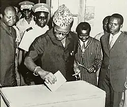 Following the promulgation of a new constitution after a referendum in 1964, general elections were held in the newly renamed Democratic Republic of the Congo in March and April in 1965. The elections were won by the Congolese National Convention, led by former secessionist leader Moise Tshombe, which took 122 of the 177 seats. However, President Joseph Kasa-Vubu later dismissed Tshombe and appointed Évariste Kimba Prime Minister instead. In a vote in parliament on 14 November, Kimba failed to have his government approved.[2] However, Kasa-Vubu reappointed him as Prime Minister the following day. Ten days later, army commander Mobutu led a military coup and installed himself as President, banning all political activity for at least five years.