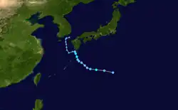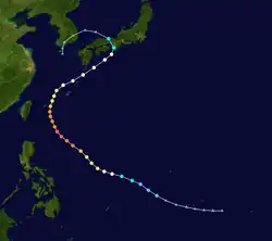 Typhoon Billie formed in the Philippine Sea as a weak depression. It intensified while heading northwards, becoming a tropical storm on the 23rd, a typhoon on the 25th, and reaching its maximum intensity of 110-knot winds and a 945-millibar central pressure as it passed the Ryukyu Islands on the 27th. The storm brushed South Korea as a category-1-equivalent typhoon on the 29th before making landfall in North Korea on the 30th.[2] The remnants of Billie dissipated over the Sino-Soviet border shortly after.