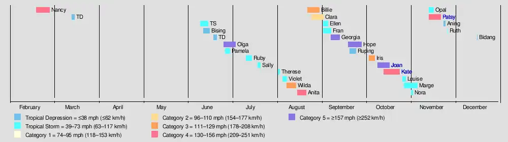 Patsy (Yoling) November 14 – 22 Violent typhoon 250 km/h (155 mph) 910 hPa (26.87 inHg) Mariana Islands, Philippines, Vietnam $80 million 262