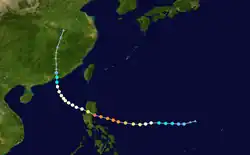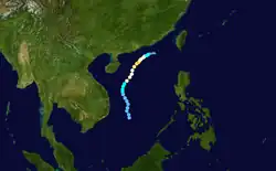 Tropical Storm Ruby formed as a disturbance east of the Philippines. It slowly traveled west-southwest, becoming a tropical storm on the 12th. It crossed the northern part of Luzon before making landfall in China on the 15th.[2] The storm became extratropical over China, and proceeded northwest, crossing Hokkaido before dissipating over the Aleutian Islands.