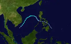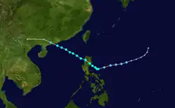 Tropical Storm Violet formed east of the Philippines, then traveled westward, becoming a tropical storm before making landfall on Luzon. Violet then crossed the South China Sea before making landfall in China as a weak tropical storm. It dissipated over China shortly after.