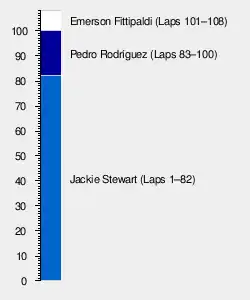At the end of the 100th lap, Rodríguez coasted into the pit lane having run out of fuel. BRM refueled the car, but Rodríguez had lost 38 seconds to Fittipaldi, who took the lead. Rodríguez rejoined ahead of the second Lotus of Wisell.
