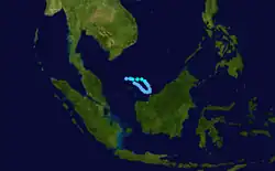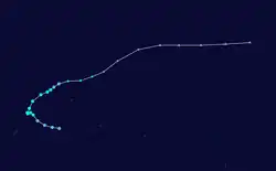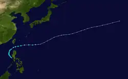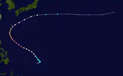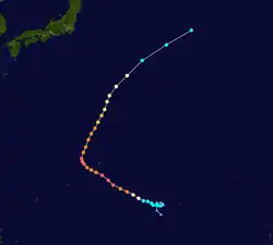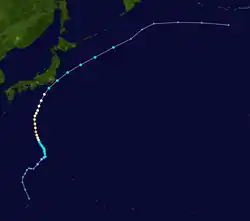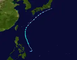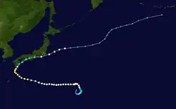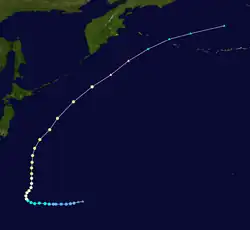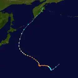 During January 8, the JMA started to monitor a tropical depression that had developed, about 500 km (310 mi) to the east of Ngerulmud, Palau.[3] Over the next day the system gradually developed further as it moved north-westwards, before it was classified as a tropical storm and named Sarah by the JTWC, after a US Navy plane had found an organised system.[3][4] The system subsequently recurved north-eastwards, before it was classified as a Severe Tropical Storm by the JMA during January 10.[5] During that day, the JTWC reported that the system had peaked, with 1-minute sustained wind-speeds of 95 km/h (60 mph).[4] Over the next day, the system quickly weakened and became an extratropical cyclone during January 11.[4] Sarah's extratropical remnants were subsequently tracked as they moved north-eastwards, until it made landfall on Canada and broke up over the mountains of British Columbia during January 17.[4]