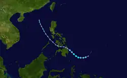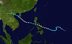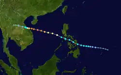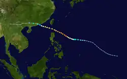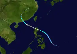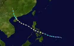 On April 23 Tropical Storm Wanda began its life to the east of the Philippines. It tracked over the archipelago, and emerged into the South China Sea on the 25th. It turned to the northwest, and became a typhoon on May 1 just off the coast of South Vietnam. The westerlies brought Wanda to the north and northeast, where it weakened until dissipating on the 4th near Hainan Island.