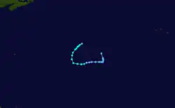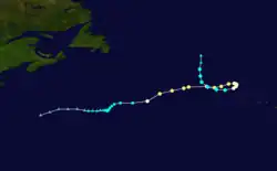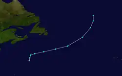 A very small, circular subtropical depression developed about 460 mi (740 km) northeast of Bermuda on September 19.[1] Initially, the storm moved north-northeastward and strengthened into Subtropical Storm Charlie early the following day. It then moved quickly northeastward and continued to strengthen. Later on September 20, Charlie peaked with maximum sustained winds of 65 mph (105 km/h). The system soon lost tropical characteristics and transitioned into an extratropical cyclone about 630 mi (1,010 km) east of Cape Race, Newfoundland, early on September 21. However, the extratropical storm deepened significantly, reaching a barometric pressure of 944 mbar (27.9 inHg), a reading typical of a strong Category 3 hurricane. Early on September 22, the extratropical cyclone dissipated over the far north Atlantic.[5]