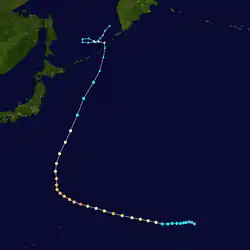 A tropical disturbance emerged from the ITCZ on July 29 and passed through the Marshalls. It became a tropical depression on July 30 and a tropical storm the next day. It and headed in the direction of Japan. Alice became a typhoon on August 2 and reached its maximum intensity on August 4 while southwest of Marcus. As Alice continued approaching Japan, it steadily weakened. It recurved, brushed Honshu, and went extratropical on August 8. It never made landfall.[10]