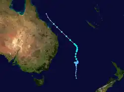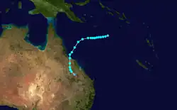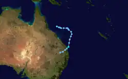 During 4 February Severe Tropical Cyclone Pam moved south-westwards into the Australian region as a Category 5 severe tropical cyclone, with peak 10-minute sustained wind speeds estimated at 205 km/h (125 mph).[11] Over the next couple of days, Pam passed about 500 km (310 mi) to the east of Brisbane, as it gradually weakened and recurved south-eastwards.[11][12] The system was last noted during 7 February as it moved back into the South Pacific basin.[11]