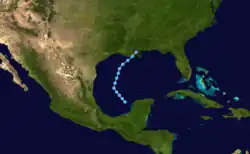 A tropical wave developed into a tropical depression on September 13 to the east of the Virgin Islands.[3][7] The system tracked westward and strengthened into Tropical Storm Eloise while passing to the north of Puerto Rico. Eloise briefly reached hurricane intensity soon thereafter, but weakened back to a tropical storm around landfall over Hispaniola. The cyclone emerged into open waters of the northern Caribbean Sea. After striking the northern Yucatán Peninsula, Eloise turned northward and re-intensified. In the Gulf of Mexico, the cyclone quickly deepened, becoming a Category 3 hurricane on September 23. The hurricane made landfall west of Panama City, Florida, before moving inland across Alabama and dissipating on September 24.[3]