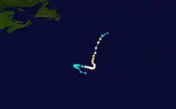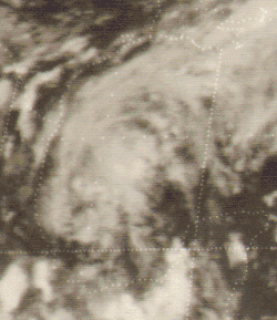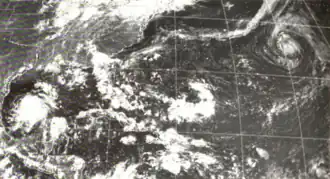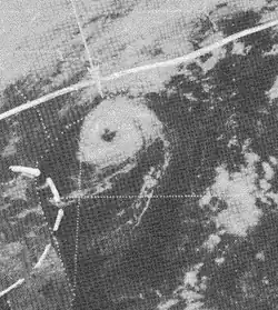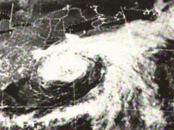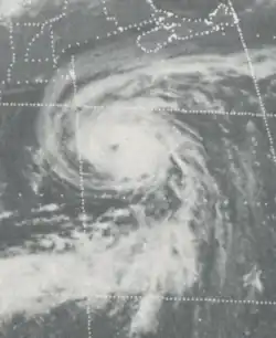 Doris made meteorological history when, on August 31, it became the first Atlantic hurricane ever to be upgraded to hurricane intensity solely on the basis of satellite pictures,[1] via the Dvorak technique.[7] The cyclone then curved northward and intensified further during the next few days, becoming a Category 2 hurricane early on September 2.[3] Based on the Dvorak technique, it is estimated that Doris peaked with maximum sustained winds of 110 mph (180 km/h) and a minimum barometric pressure of 965 mbar (28.5 inHg) shortly thereafter. By September 3, the hurricane began interacting with a non-tropical low pressure area.[7] On the following day, Doris quickly weakened to a tropical storm and transitioned into an extratropical cyclone about 830 mi (1,340 km) south-southeast of Cape Race, Newfoundland, around 06:00 UTC. The extratropical remnants weakened and then dissipated late on September 4.[3]