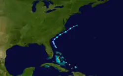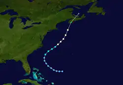As the storm tracked to the east of the Bahamas, a curve to the north began, at which time an anticyclone developed atop the cyclone.[7] This subsequently allowed Gladys to rapidly intensify into a Category 4 hurricane, reaching maximum sustained winds of 140 mph (230 km/h) and a minimum barometric pressure of 939 mbar (27.7 inHg) on October 2. Thereafter, Gladys began to weaken and passed very close to Cape Race, Newfoundland, before losing tropical characteristics on October 3 while situated about 385 mi (620 km) northeast of St. John's.[3] Subsequently, the remnants merged with a large extratropical cyclone on October 3. Effects from the system along the East Coast of the United States were minimal, although heavy rainfall and rough seas were reported.[7] In Newfoundland, strong winds and light precipitation were observed.[29]