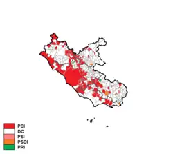 Christian Democracy was narrowly behind the Italian Communist Party. After the election Roberto Palleschi, a Socialist became President of the Region with the support of the Italian Communist Party (Frontism).