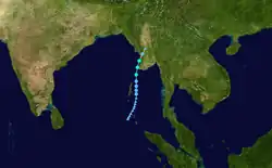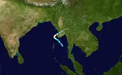 On May 5, Cyclone Three formed offshore of Thailand before recurving into Burma on May 7 as a hurricane-force system. Three moved inland and dissipated on May 8.