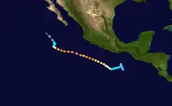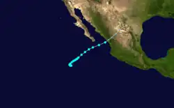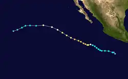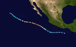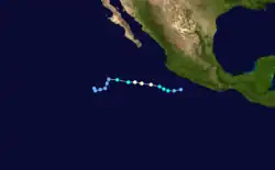 A tropical disturbance was first noted about 345 miles (555 km) south of the Guatemalan coastline on September 27.[2] It organized into Tropical Storm Madeline by 00:00 UTC on September 29 but failed to further develop, instead weakening to a tropical depression the next morning. By 00:00 UTC on October 4, Madeline re-intensified into a tropical storm, beginning a gradual curve toward the north as well. The system continued to strengthen and became a hurricane early on October 6; by 06:00 UTC on October 8, Madline peaked as a Category 4 hurricane with winds of 145 mph (233 km/h). It moved onshore the coastline of Mexico a few hours later, rapidly weakening and losing its status as a tropical cyclone after 18:00 UTC that day.[3]
