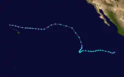 Late on August 23, an area of disturbed weather developed about 485 miles (781 km) south of Acapulco, Guerrero.[2] It rapidly coalesced into a tropical depression around 00:00 UTC the next day, but only slowly strengthened into Tropical Storm Iva by 18:00 UTC on August 25.[3] The system moved west and then west-northwest, further developing into a hurricane by 18:00 UTC on August 26 as a small eye became distinct.[2] Iva attained major hurricane strength late on August 27, further intensifying to its peak as a Category 4 hurricane with winds of 130 mph (210 km/h) around 06:00 UTC the following morning.[3] It oscillated in strength over the subsequent 24 hours, but ultimately began a steady weakening trend by August 30 while passing over marginal ocean temperatures.[2] Iva fell to tropical storm strength early that day, weakened to a tropical depression early on September 1, and dissipated around 00:00 UTC on September 2.[3]