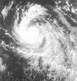 An area of disturbed weather formed well south of Mexico around 18:00 UTC on August 5.[2] It intensified into a tropical depression 24 hours later and further organized into Tropical Storm Hyacinth by 06:00 UTC on August 7. On a west-northwest track, the storm continued to strengthen and became a hurricane around 12:00 UTC on August 9,[3] after which time a small yet distinct eye became evident on satellite imagery.[2] Hyacinth attained its peak as a Category 3 hurricane with winds of 115 mph (185 km/h) the next day,[3] but soon began to weaken as it rapidly moved toward cooler waters.[2] It weakened to a tropical storm early on August 13 and further degraded to a tropical depression on August 14 before being absorbed by nearby Tropical Storm Gwen around 06:00 UTC that day.[2][3]