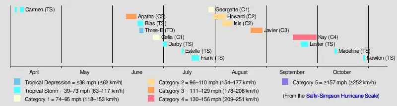 | Georgette | July 28-31 | Category 1 hurricane | 75 (120) | Unknown | Socorro Island | None | None | |||